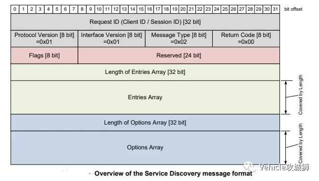 那么Client是怎么知道Server提供哪些服务呢,就是通过SOME/IP-SD来实现服务发现过程的。SOME/IP服务发现用于定位服务实例、检查服务是否可用以及部署发布和订阅句柄,。服务发现只能通过UDP实现。SOME/IP-SD是一种特殊的SOME/IP格式,它对SOME/IP-SD报文中的Payload进行了定义和实现,。而Message ID字段则是固定的0xFF FF 81 00。