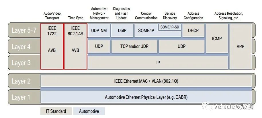 如上篇阐述的,车载以太网采用基于 TCP/IP 的网络分层模型,TCP/IP 模型没有对 OSI 的 5~7 层做严格区分,统称为应用层,如上。