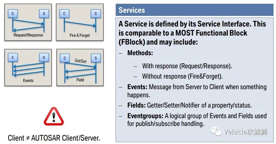服务是SOME/IP的最核心概念,在一个服务中,定义了Server和Client两个角色:Server提供服务,Client调用服务。对于同一个服务,只能存在一个Server,但可以同时存在多个Client调用服务,一个Service由Event/Method/Field组成。