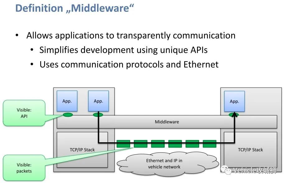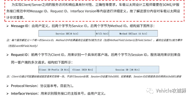 其中应用层协议有关的协议有SOME/IP、AVB/TSN、DoIP等,本篇我们主要阐述SOME/IP协议。SOME/IP (Scalable Service-Oriented MiddlewarE Over IP) ,即“运行于IP之上的可伸缩的面向服务的中间件”,它是车载以太网技术中的核心内容,可用于控制消息及应用数据传输,该技术是SOA架构的重要支撑。它在系统中其实就是一个中间件的存在,所谓“Middleware中间件”是一种独立的系统软件或服务程序,分布式应用软件可借助Middleware在不同的技术之间共享资源。所谓的分布式应用软件,在这里指的就是“服务”;不同的技术之间,在这里指的就是“不同的平台或操作系统,比如Adaptive AUTOSAR系统等。因此SOME/IP用于面向服务的通讯,可实现方法复用和扩展、可降低负载(因SOME/IP是在接收方有需求的时候才发送,这种方法的优点在于总线上不会出现过多不必要的数据,从而降低负载。)并适用于不同操作系统