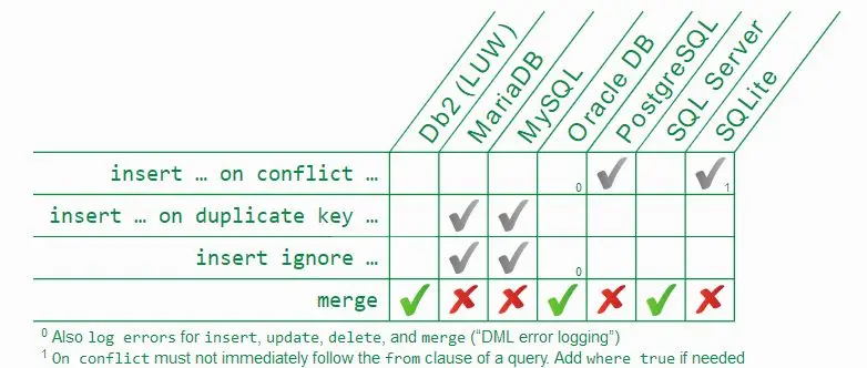 这是一个特有的SQL扩展,即它不是标准SQL的一部分,因此在下面的矩阵中是灰色的。但是,SQLite遵守与PostgreSQL相同的语法来实现此功能0。该标准提供了对merge语句的支持。