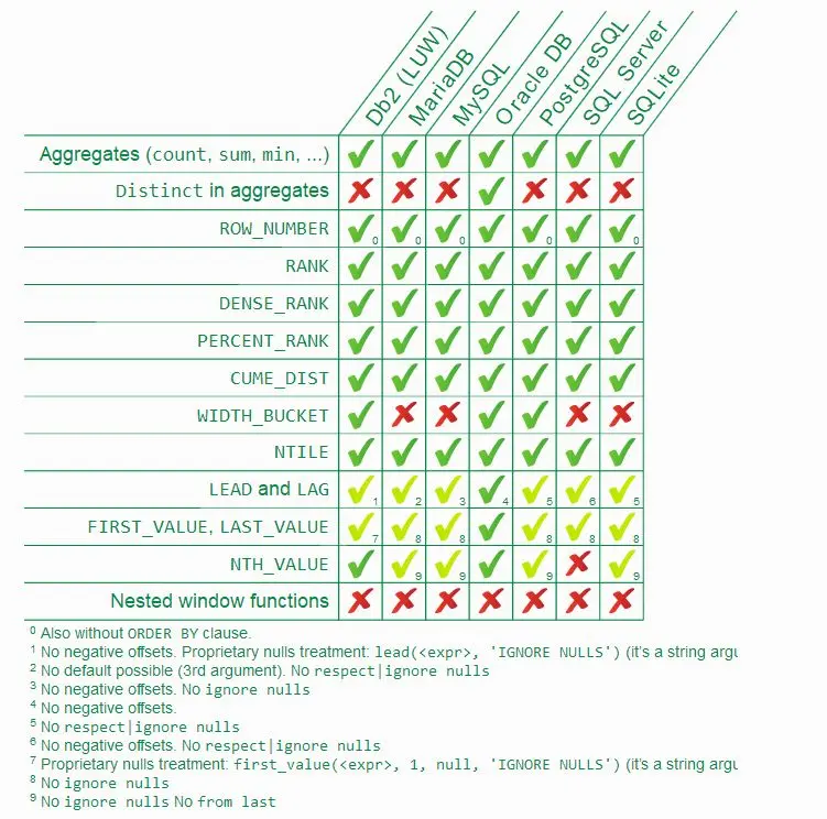 SQLite对于窗口函数的支持在业界是领先的。它不支持的功能在其他一些主要产品中也同样不支持(在聚合中语句中的distinct,width_bucket, respect|ignore nulls和from first|last等语句)。
