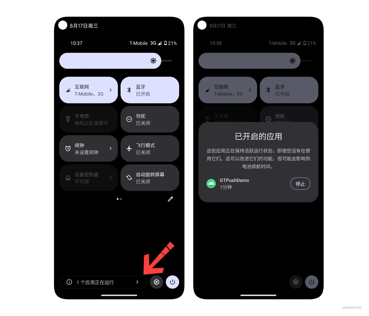 如下图,用户可以在下拉的通知栏中直接关闭前台服务和应用程序: