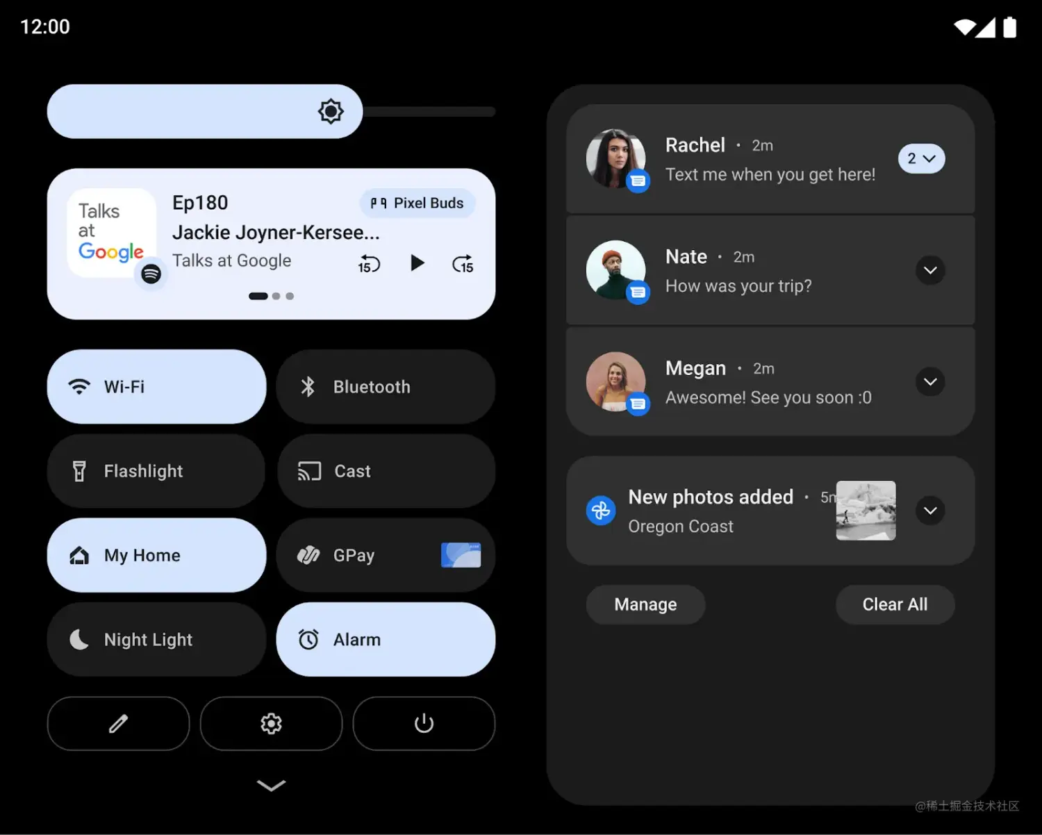 ▲Android13系统下,用户可以将“快速设置”版块和“通知栏”版块置于同屏当中。