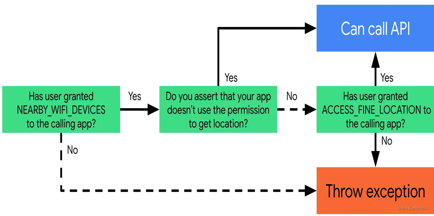 如果App仅需要使用WiFi相关的API,并不需要使用getScanResults()、startScan()等与位置相关的API,那么建议App开发者切换到新的NEARBY_WIFI_DEVICES权限。