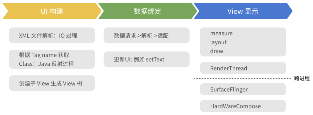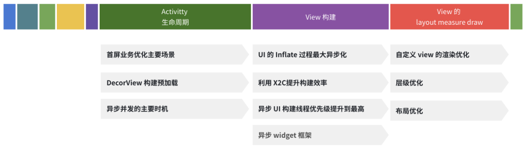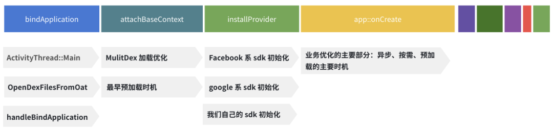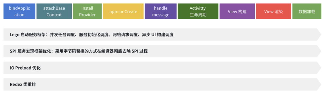 启动性能是 APP 使用体验的门面,启动过程耗时较长很可能导致用户使用 APP 的兴趣骤减,抖音通过对启动性能做劣化的 AB 实验也验证了其对于业务指标有影响显著。抖音拥有数亿的用户,启动耗时几百毫秒的增长就可能带来成千上万用户的留存缩减,因此,启动性能的优化成为了抖音 Android 基础技术团队在体验优化方向上的重中之重。 本文基于过往对抖音 Android 客户端做启动性能优化的实战经验总结提炼出普适性的方法论,并将该过程中沉淀的工具加以分享,希望能给大家带来一些新的思考。 抖音 Android 性能优化系列往期文章回顾:新一代全能型性能分析工具 Rhea 假如你要负责优化抖音的启动性能,你会怎样去规划整体的优化方案?你可能会一下子想到很多方面的细节点,比如:要优化主线程耗时、要减少布局层级、要对某些启动任务做按需加载或预加载、要避免主线程 IO、要对线程使用进行优化、还要有分析工具帮助定位性能问题等…… 然而,该如何系统性地把这些细碎点组织起来并按照一定的章法来落地启动优化呢?此时,需要我们在具体细节点之上有进一步的问题分解与深入思考,最终形成一套完整的方法论,不仅能覆盖所有细节点,还能切实指导在实战中达成启动优化的效果。切实有效的方法论必然是从实战中经过千锤百炼才能形成的,而抖音庞大的用户基数又进一步保障了方法论的可行性与普适性。那么接下来让我们带着前述问题来看抖音的启动优化方法论是怎样的又是如何应用于实战之中的。 抖音的启动性能优化方法论分为五部分,分别是:理论分析、现状分析、启动性能优化、线上验证与防劣化。 这五部分间存在明显的先后顺序,又能闭环达成可持续的启动性能优化,下面将对这五部分做详细阐述: 理论分析放在最先是为了从一开始就避免让视野受到限制,很多同学往往一开始接手启动优化就容易陷入对各种现状细节的分析,拘泥于片面的潜在可优化点,这样就难以做到对全局和优先级的把控,所以,我们应该首先跳出现状,从更加全局的视角来思考整体优化的目标和策略。这里可以利用特斯拉创始人——埃隆·马斯克所推崇的“第一性原理”思考法: “通过第一性原理,把事情升华到最根本的真理,然后从最核心处开始推理。” 基于此,我们在做启动优化的理论分析时可以从更本源的角度出发做到全局思考,比如抖音会做从进程创建到页面展示的全启动路径分阶段耗时分析、还会按照消耗的系统资源类型做耗时成因分析,通过这种极致的耗时分析可以带来极致的优化策略,此外,从全路径出发还能够发现容易忽视的问题、探索优化的极限。 在完成理论分析后,我们基本具备了全局的视角,并且也大致清楚了整体的优化目标和策略,接下来就要基于此来做现状分析从而明晰实现目标的具体路径: 在这部分需要尤其注意三点:优质的 profile 工具(这里推荐使用同样来自基础技术团队的“新一代全能型性能分析工具”)、线下 trace 结合线上监控综合分析、根据投入产出比评估实施优先级,这三点是保障切实有效取得启动优化收益的关键。 在完成了理论和现状分析后,就可以根据规划的路径来实施具体的启动优化项了。在实施过程中,主要考虑主线程优化、后台线程优化和全局优化三个维度: 在完成了具体的优化项施工后,就来到了线上验证大盘收益的阶段。这个阶段有三点需要注意: 在线上验证优化措施取得切实收益后,并不是万事大吉了,持续保持住优化效果才算完整达成了启动性能优化的目的。其实不仅是启动优化,整个性能优化领域都是围绕着“攻”和“守”来展开的,“攻”即为前述的分析与优化,而“守”则是防止劣化,在防劣化方面大家往往不会像优化的方面那么重视,但实际上能防止劣化是可持续取得优化效果的前提(否则新的优化效果会用于弥补劣化甚至入不敷出),并且防劣化相比于优化是更能持久有益的。 抖音启动性能防劣化的进程分为了三个时期,不同时期有不同的表现与应对手段,这很可能是大多数 APP 优化启动性能都要经历的,这里提炼出来以供参考: 古人云“纸上得来终觉浅,绝知此事要躬行”,前述的方法论讲得再详细再透彻也会与实际的落地存在隔阂,为了做到真正的学以致用,下文将细致讲解如何将启动优化方法论应用于实践之中。 抖音在理论分析部分会对启动流程分别作全路径分析和耗时成因分析,前者用于发现全路径各个阶段的潜在耗时点避免疏漏,后者用于系统性地将各个耗时点归因从而引导我们找寻优化思路,关于这两部分的具体实践如下: 启动性能全路径分析:抖音的启动路径和大多数 APP 类似,整体分为两大阶段和两个间隙,它们按时间顺序排布为:Application 阶段、handle message 间隙、Activity 阶段和数据加载间隙,全路径各部分细分涵盖的内容如下图所示: APP 进程由 zygote 进程 fork 出来后会执行 ActivityThread 的 main 方法,该方法最终触发执行bindApplication,这也是 Application 阶段的起点;然后是我们在应用中能触达到的attachBaseContext阶段,4.x 的机型在该阶段具有较长的 MultiDex 耗时可以做针对性优化(可参考“抖音 BoostMultiDex 优化实践”),本阶段也是最早的预加载时机;接下来是installProvider阶段,很多三方 sdk 借助该时机来做初始化操作,很可能导致启动耗时的不可控情形,需要按具体 case 优化;此后就到了 Application