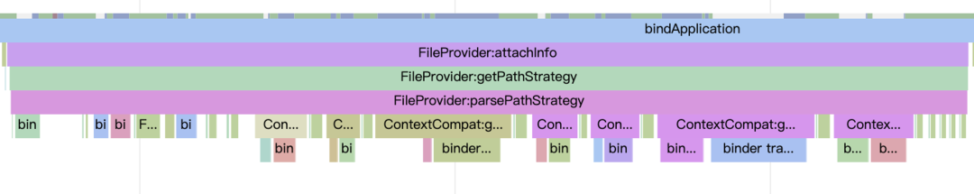 从上面的过程来看,只要我们在启动阶段没有 FileProvider 的调用,是不会有 FileProvider 的相关耗时的。但实际上从启动 trace 来看,我们的启动阶段是存在 FileProvider 相关耗时的,具体的耗时则是在 FileProvider 的生命周期方法 attachInfo 方法中,FileProvider 的 attachInfo 方法除了会去调用我们最为熟悉的 onCreate 方法,同时还会去调用 getPathStrategy 方法,我们的耗时则是集中在这个 getPathStrategy 方法中。