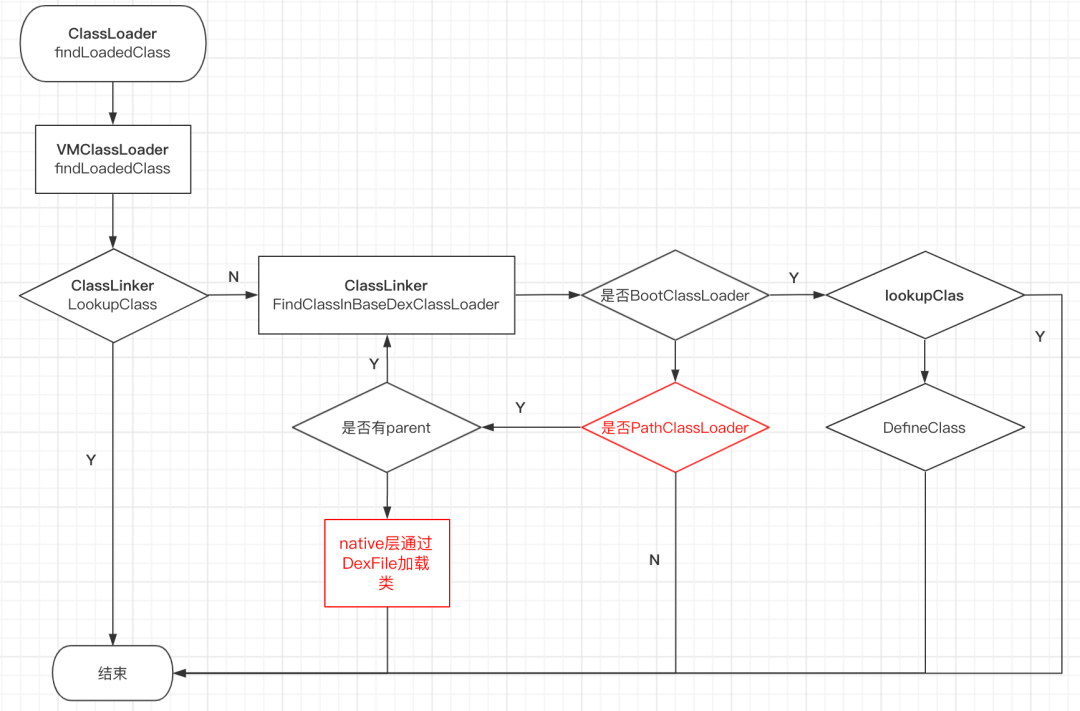 首先调用 PathClassLoader 的 findLoadedClass 方法去查找已加载的类中查找,这个方法将会通过 jni 调用到 ClassLinker 的 LookupClass 方法,如果能够找到则直接返回; -