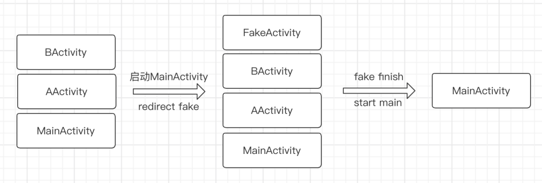 针对这个问题我们的解决方案是,对于应用内所有启动 MainActivity 的 Intent 增加 FLAG_ACTIVITY_NEW_TASK 与 FLAG_ACTIVITY_CLEAR_TOP 的 flag,以实现类似于 singletask 的 clear top 的特性。
