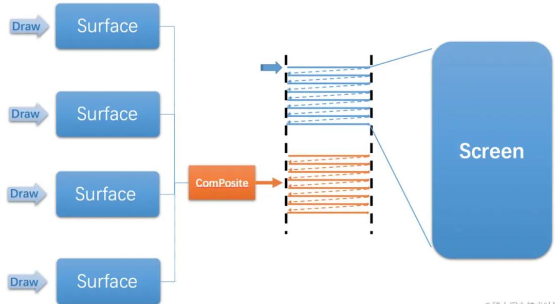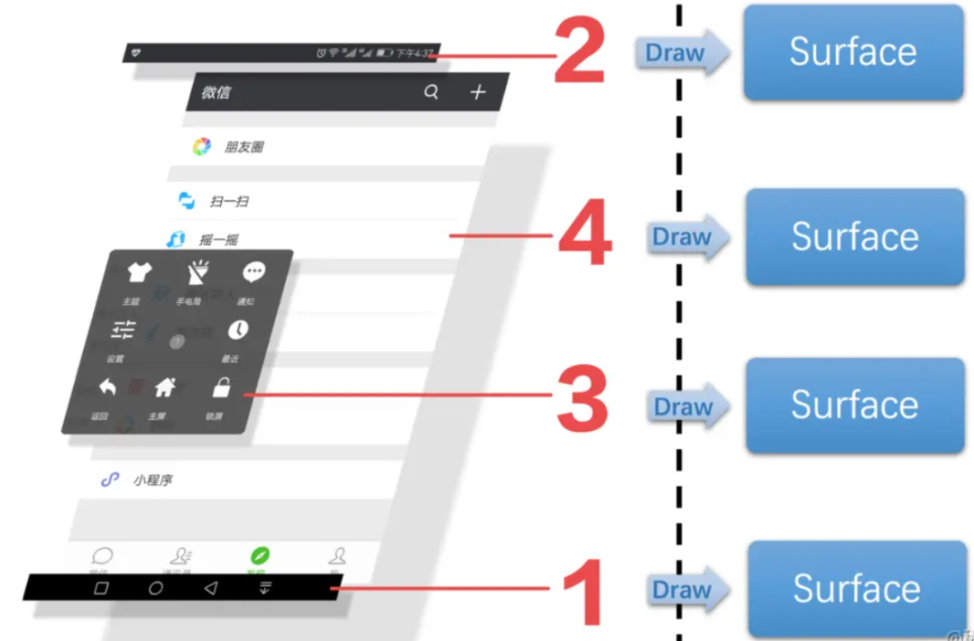 在 Android 中,一个 view 会有对应的 canvas。视图树对应一个 canvas 树,Surfaceflinger 控制多个 canvas 的合成。最终渲染完成输出位图数据,显示到手机屏幕。