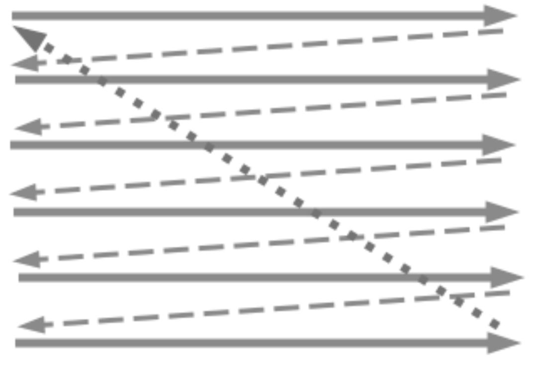 上边讲了屏幕上绘制图像需要的原始数据叫做位图。那么问题来了,有了位图数据之后如何将图像绘制到屏幕上呢?如下图所示:电子枪从上到下逐行扫描,扫描完成后显示器就呈现一帧画面。然后电子枪回到屏幕初始位置进行下一次扫描。为了同步显示器的显示过程和视频控制器的扫描过程,显示器会用硬件时钟产生一系列的定时信号。当电子枪换行进行扫描时,显示器会发出一个水平同步信号;当一帧画面绘制完成后,电子枪回到原位,准备画下一帧前,显示器会发出一个垂直同步信号。显示器通常以固定的频率进行刷新,这个刷新率就是垂直同步信号产生的频率。