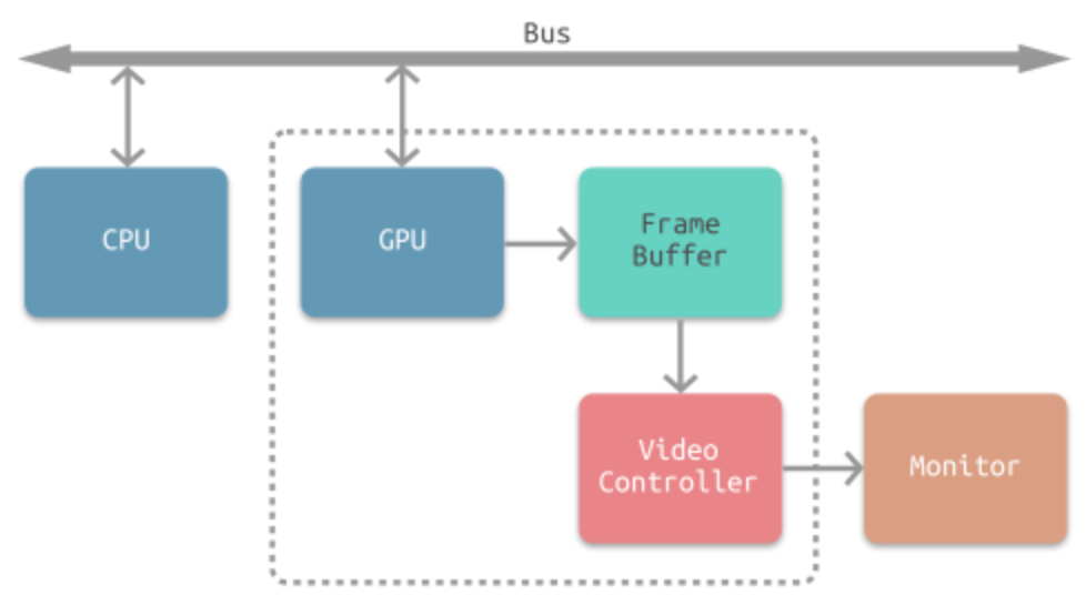 前一部分介绍了视频控制器将位图数据显示到物理屏幕上的过程,那么位图数据是怎么得到的呢?其实位图数据是通过 CPU、GPU 协同工作得到的。下图就是常见的 CPU、GPU、显示器协同工作的流程。CPU 计算好显示内容提交至 GPU,GPU 渲染完成后将渲染结果存入帧缓冲区,接下来就需要将得到的像素信息显示在物理屏幕上了,这时候视频控制器(Video Controller)会读取帧缓冲器中的信息传递给显示器(Monitor)进行显示。完整的流程如下图所示:
