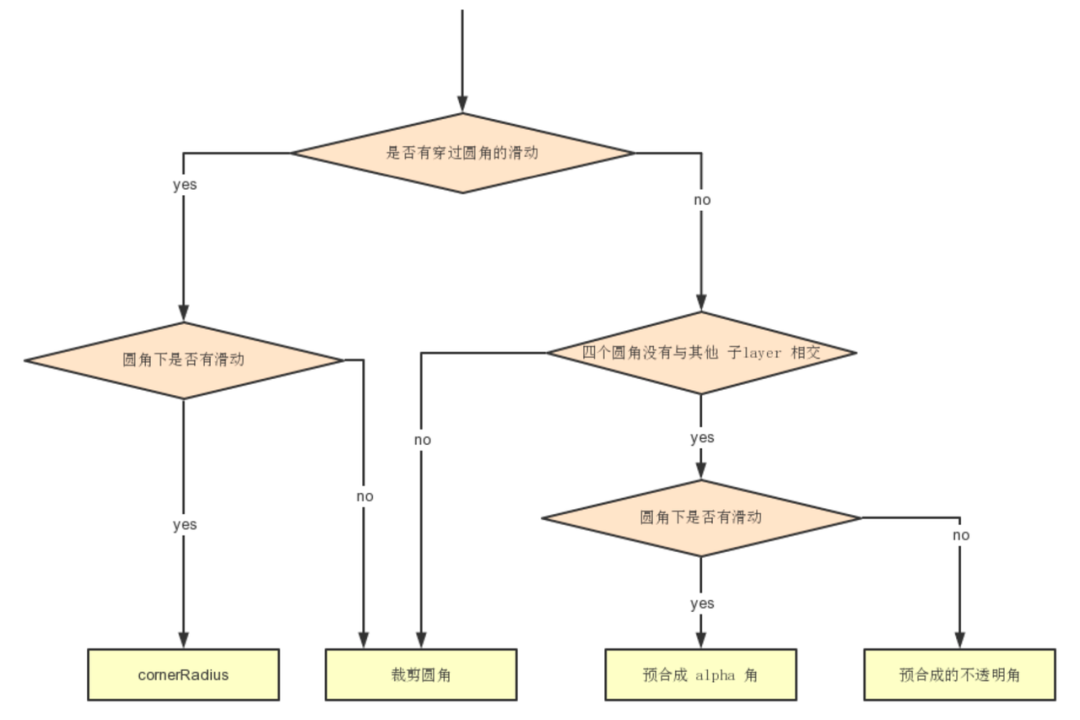 上边提到了圆角的优化要考虑的条件以及不同的圆角实现方案,下边这个流程图就是把条件和方案对应起来,给出了圆角的最佳实现方案。