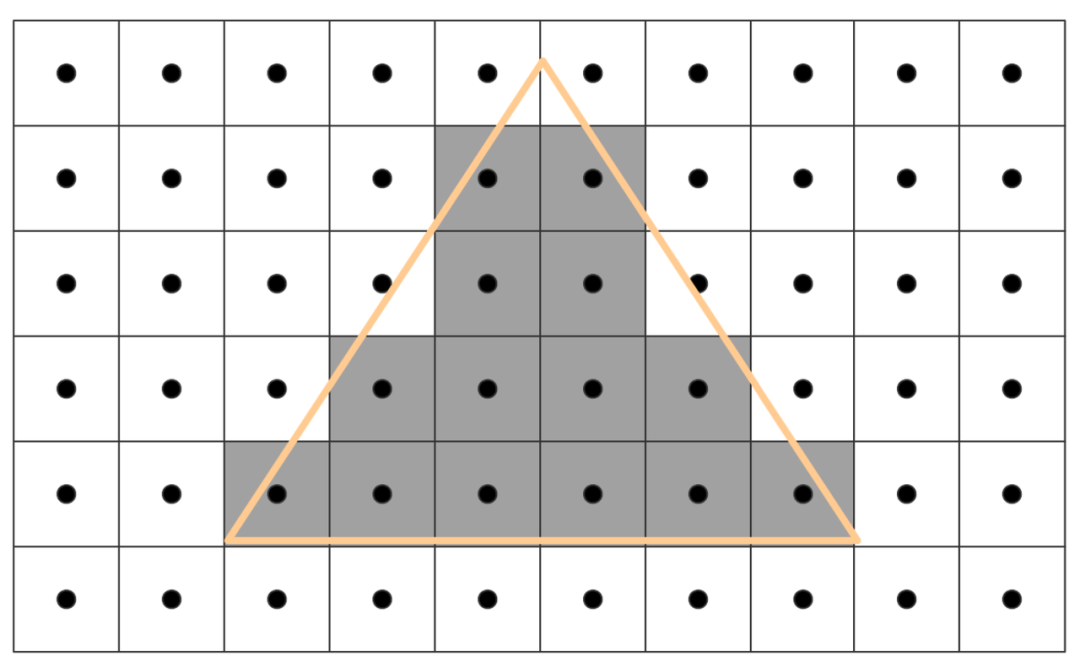 如上图所示,我们可以看到,每个像素的中心有一个点,光栅化便是用这个中心点来进行划分的,如果中心点在图元内部,那么这个中心点所对应的像素就属于该图元。简而言之,这一阶段就是将连续的几何图形转化为了离散化的像素点。