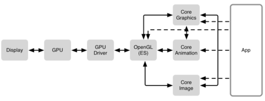 OpenGL ES 和 Metal 都是第三方标准,基于这些标准具体的内部实现是由对应的 GPU 厂商开发的。Metal 是苹果的一套第三方标准,由苹果实现。很多开发者都没有直接使用过 Metal,但却通过 Core Animation、Core Image 这些核心的系统框架在间接的使用 metal。