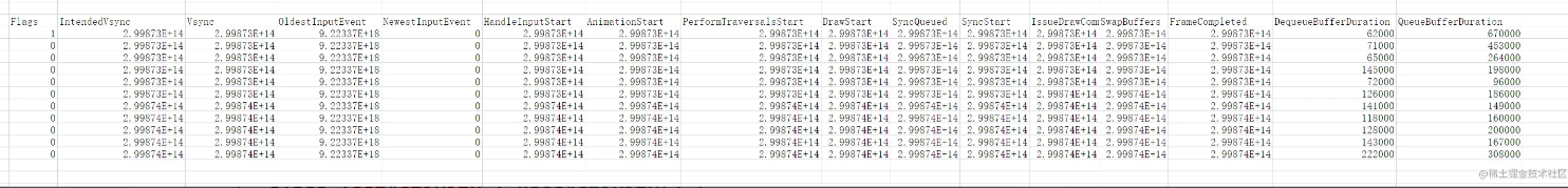 每一行表示一帧绘制的时间信息,一共有 16 列,每一列表示一个关键节点的时间戳,比如PerformTraversalsStart表示绘制遍历的开始时间点,DrawStart表示onDraw()开始的时间点,前者减去后者表示measure + layout的耗时。