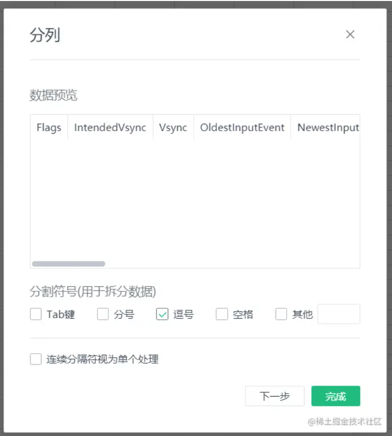 原生输出信息没有可读性,但它们遵守 csv 格式,复制粘贴到 wps 表格中,选中 数据 — 分列,用“逗号”分割: