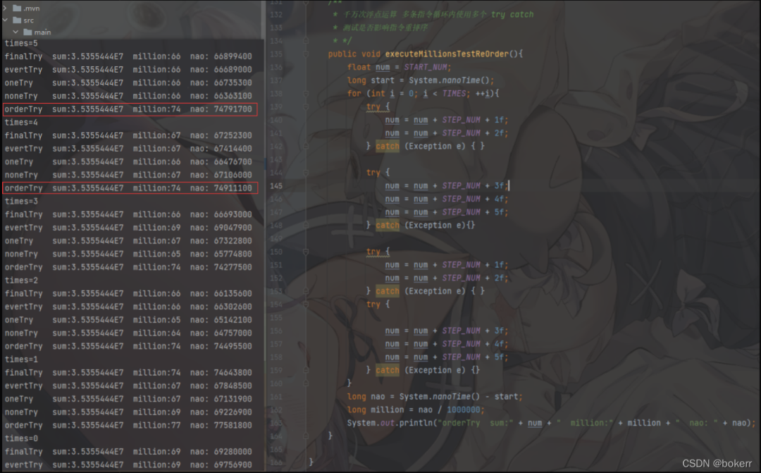 执行结果如下图,难分胜负,波动只在微秒级别,执行速度也快了很多,编译效果拔群啊,甚至连 “解释模式” 运行时多个try catch 导致的,多个goto跳转带来的问题都给顺带优化了;由此也可以得到 try catch 并不会影响即时编译的结论。