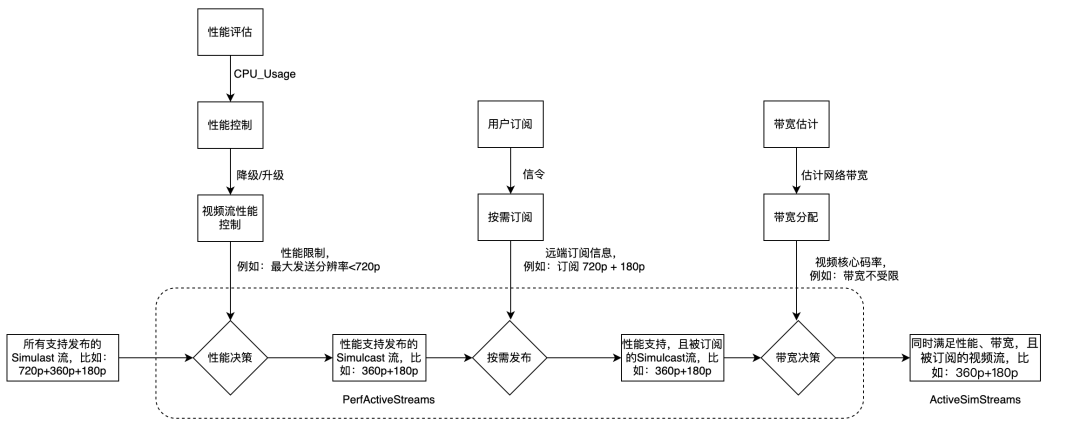 除了性能和带宽之外,火山引擎 RTC 还支持按需发布能力,发布端结合三者采用如下方案进行综合决策。