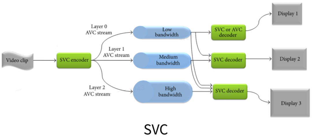 SVC(Scalable Video Coding, 可适应视频编码)是指,一条视频码流可以分成多个层级(layer) , 在保证整条流的可解码性的情况下,用户可以根据层级的优先级选择丢弃某些层级的全部或部分片段,得到不同帧率(temporal / 时域)/分辨率(spatial / 空域)/ 画质(quality / 质量)的视频流。