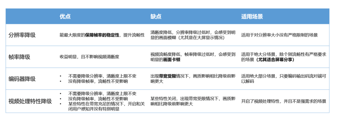 典型的降级路径是:先对视频流降级,再降级屏幕流;升级顺序和降级顺序正好相反。