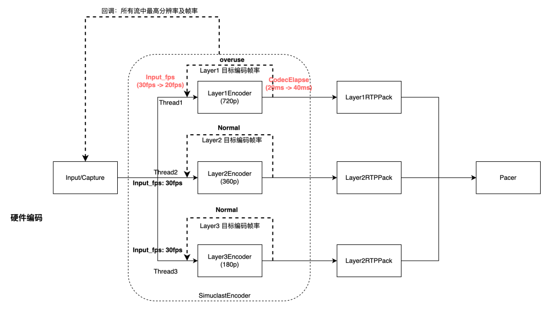 因为火山引擎 RTC 编码器采用并行方案,单路 Simulcast 流的编码延时高,降级可以选择同时降级所有流的帧率,也可以选择只降级编码延时较高流的帧率,而不影响其他 Simulcast 流。