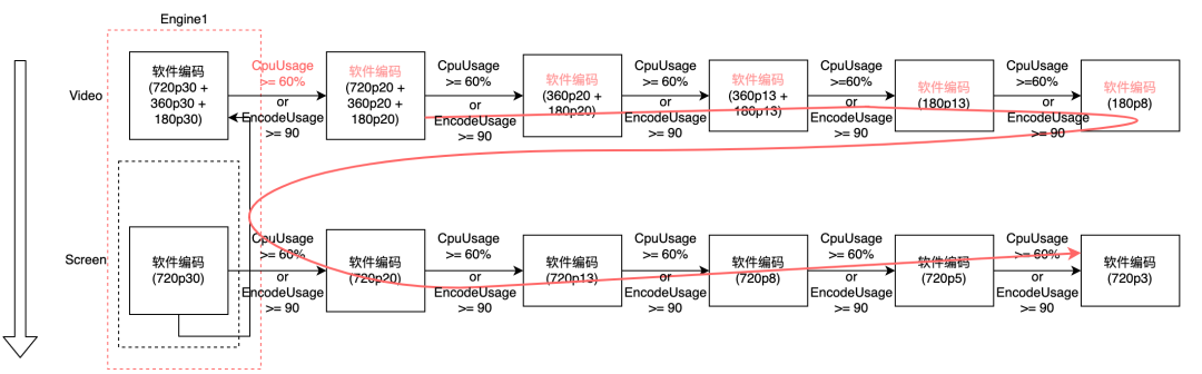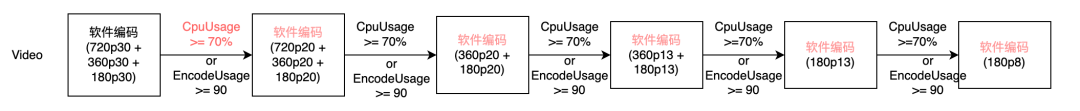 降级编码器指,降级编码器档位,或者切换到性能更好的编码器。通常,编码压缩率越高的编码器,编码性能消耗越高。因此,当系统负载较高时,可以切换到压缩率相对低的编码器或者编码档位,降低性能消耗。