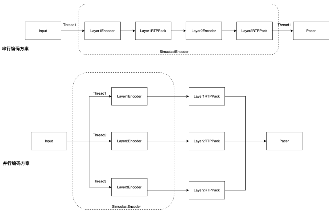 火山引擎 RTC Simulcast Encoder 之间采用完全并行的编码方案,每条 Simulcast 流处在不同的 Pipeline 上,线程之间相互不影响。相比 WebRTC Simulcast Encoder 之间串行的编码方案,并行编码方案效率更高, 并且编码效率基本不受 Simulcast 流数的影响。