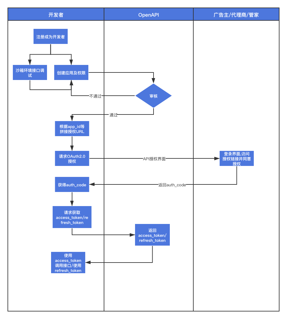 对接不同的广告平台完成OAuth2授权,最主要的是阅读帮助文档,一步步完成授权流程。下面就以抖音集团旗下某业务平台授权为例,简单介绍授权流程。