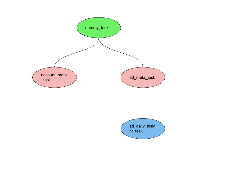利用JSON可以组织任务的依赖关系,在如下示例中,我们定义了四个任务,第一个任务为 dummy_task,它是一个空任务,利用它组织下游的 account_meta_task 和 ad_meta_task 并列关系,这两个任务是可以并发执行的;但是对于任务 ad_daily_insight_task,则需要等待 ad_meta_task 执行完后才会执行。