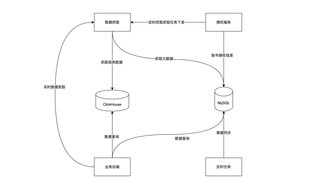 数据抓取服务的主要作用就是保证投放平台与广告平台数据一致性,对于授权的广告账户添加天粒度和小时粒度的数据抓取任务,保证元数据和报表数据的及时更新;对于Oauth2类型的渠道,提供自定义间隔时间的Access Token刷新任务;同时提供实时抓取接口,方便实时数据的获取。业务后端的主要作用就是使用授权的账号完成计划创编工作,对数据进行汇总查询。