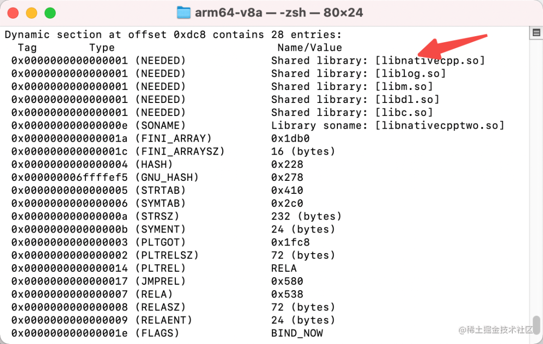 那么我们so中,如果依赖于其他的so,那么这个信息存在哪里呢!?没错,它其实也存在elf文件中,不然链接器怎么找嘛,它其实就存在.dynamic段中,所以我们只要找打dynamic段的偏移,就能到dynamic中,而被依赖的so的信息,其实就存在里面啦 我们可以用readelf(ndk中就有toolchains目录后) 查看,readelf -d nativecpptwo.so 这里的 -d 就是查看dynamic段的意思。
