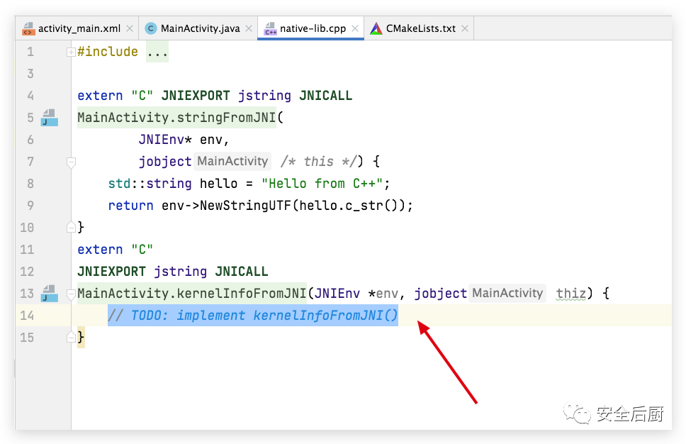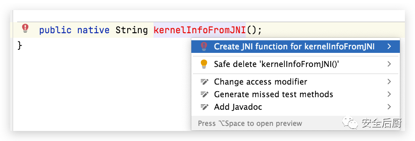 选择第一个提示,创建一个jni方法。回车。这样ide直接帮你创建好了方法了。