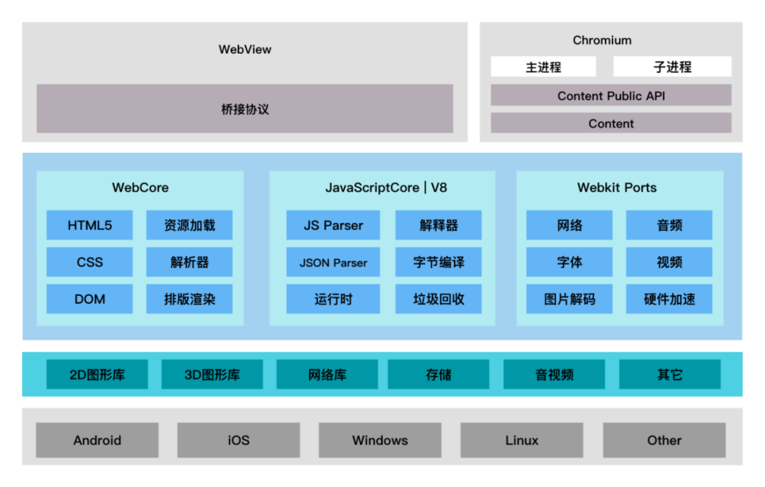 WebCore是浏览器加载和排版渲染页面的基础,主要包括资源加载、HTML解析、CSS解析、DOM解析、排版渲染等,JavaScript引擎是JavaScript解析器,JavaScriptCore是Webkit的JavaScript引擎,V8是Google的Blink的默认引擎;WebKit Ports是WebKit中移植部分,包括网络、字体、图片解码、音视频解码、硬件加速等模块;然后再往下也使用了很多第三方库,包括2D图形库、3D图形库、网络库、存储库、音视频库等;最底层是操作系统,支持Android、iOS、Windows等系统。