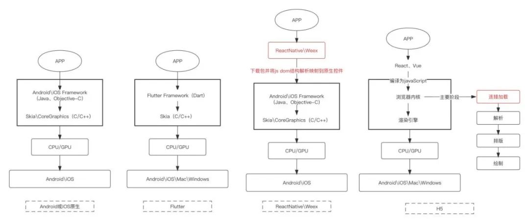 H5:以React和Vue为例,会将以框架开发的代码编译为JavaScript原生代码,即然后在浏览器或者WebView中执行;内核会先建立连接、加载资源,然后解析、排版布局、绘制渲染呈现给用户。