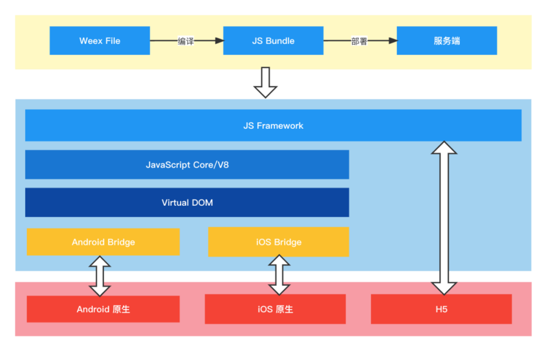 Weex和ReactNative类似,weex会将源码编译为js bundle,这些js bundle可以部署在服务端,APP下载完js bundle后,通过js引擎构建虚拟dom并通过桥接映射到原生dom,由原生渲染引擎进行渲染。