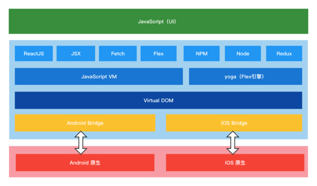 基于ReactNative或Weex开发APP则不同,首先业务逻辑是基于React或Weex开发,然后会将js bundle包预置或下载到APP,然后将虚拟dom通过bridge映射到原生控件,再调用原生渲染引擎进行渲染展示。