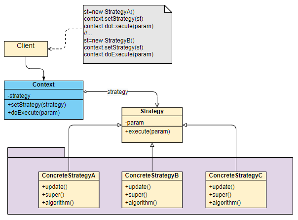 4. 建立上下类,该类可以动态的对算法进行setter,创建调用具体算法的方法,上下文可通过该方法与具体的策略交互;