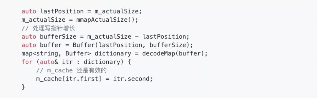当一个进程发现 mmap 写指针增长,就意味着其他进程写入了新键值。这些新的键值都 append 在原有写指针后面,可能跟前面的 key 重复,也可能是全新的 key,而原写指针前面的键值都是有效的。那么我们就要把这些新键值都读出来,插入或替换原有键值,并将写指针同步到最新位置。