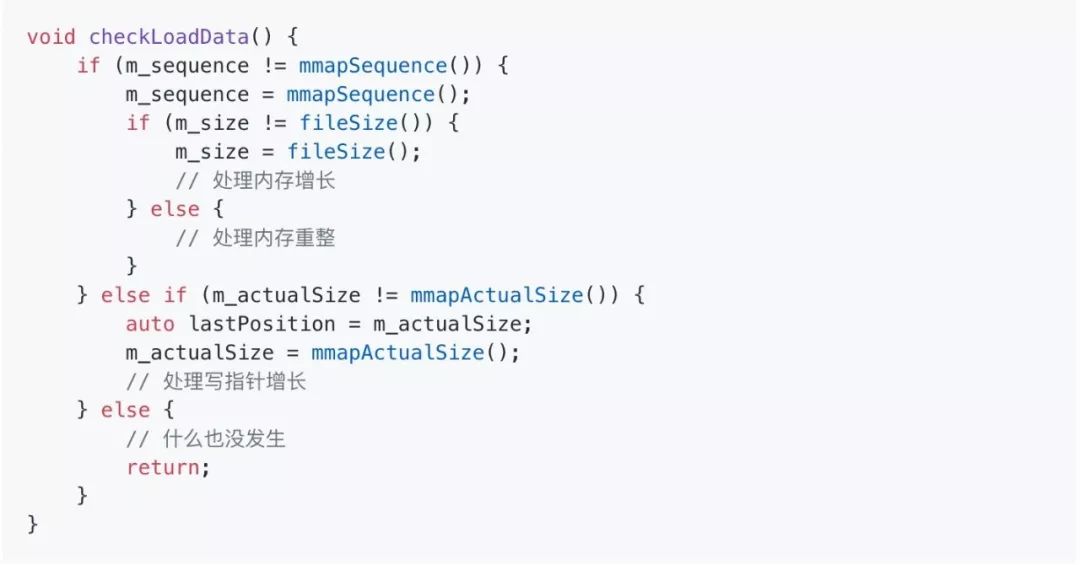 我们可以在每个进程内部缓存自己的写指针,然后在写入键值的同时,还要把最新的写指针位置也写到 mmap 内存中;这样每个进程只需要对比一下缓存的指针与 mmap 内存的写指针,如果不一样,就说明其他进程进行了写操作。事实上 MMKV 原本就在文件头部保存了有效内存的大小,这个数值刚好就是写指针的内存偏移量,我们可以重用这个数值来校对写指针。