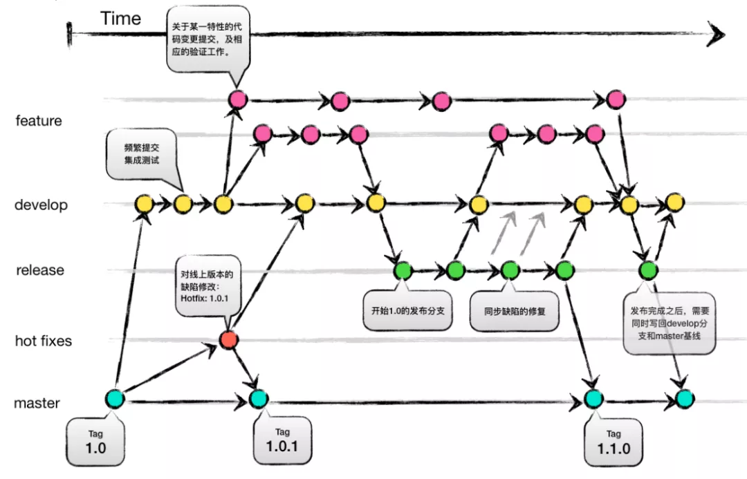- Git-Flow 模式 解决多个不同功能之间并行开发需要的一种工作方式,开发人员、开发任务对于主线是隔离的。任何版本迭代、功能需求总是从基线拉出新分支开发,完成后回流。功能分支的生命周期过长会不断加剧合并冲突。