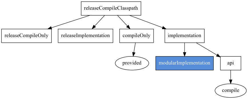 configurations { create("modularImplementation").apply { getByName("implementation")?.extendsFrom(this) }}