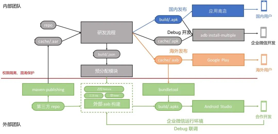 - 合作团队有很多引擎开发或 SDK 开发,他们能更聚焦第三方库。利用 .aab 缓存和预分配 feature 构建,不必在企业微信工程编译后集成测试,仍保持了真实用户运行环境。