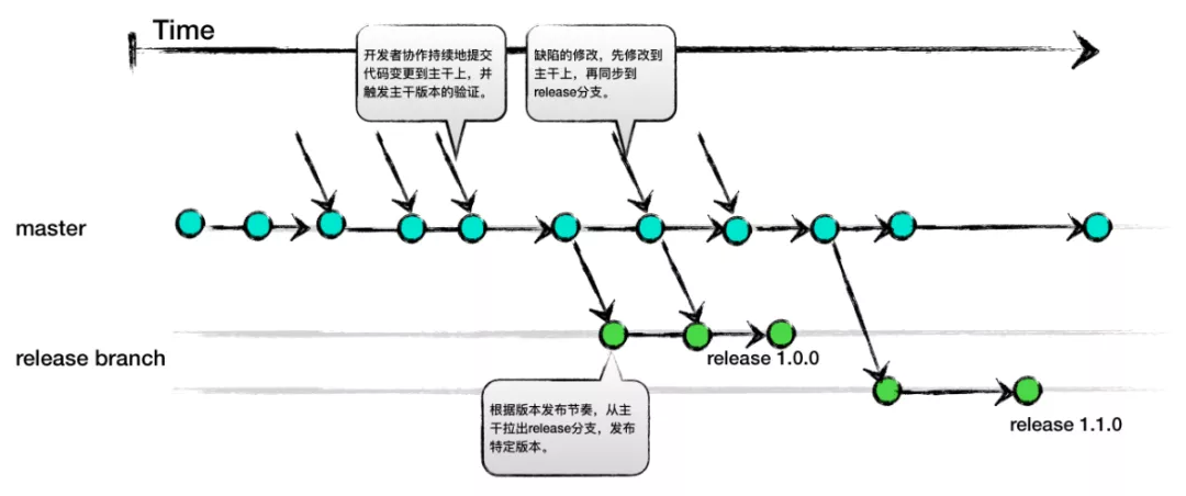 - 主干开发模式 所有开发者都在版本主干上开发。因为没有长期分离的功能开发分支,任何代码变更持续地更新到主干上,在一定程度上避免了 merge 代码带来的困扰。而每次代码提交都会触发集成验证,这就要求每次代码的变更在主干上都能快速地验证。