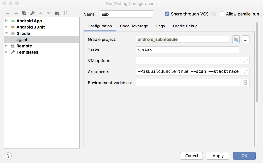 dist:module配置并不影响普通 apk 编译,在按编译环境使用不同插件、倒置依赖关系即可。base 需要特别判断dynamicModules - 运行切换 在 Android Studio 中提供带 VCS 的运行配置,调用 Gradle 任务执行即可