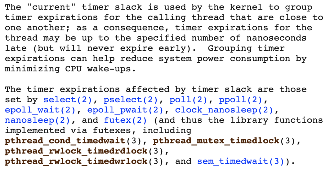 聪明的你应该敏锐的发现了这个TimerSlackHigh,“懒惰定时器”,名字看起来就非常可疑,很有可能跟我们在查的sleep/wait延迟有关,赶快查一下TimerSlack是什么: