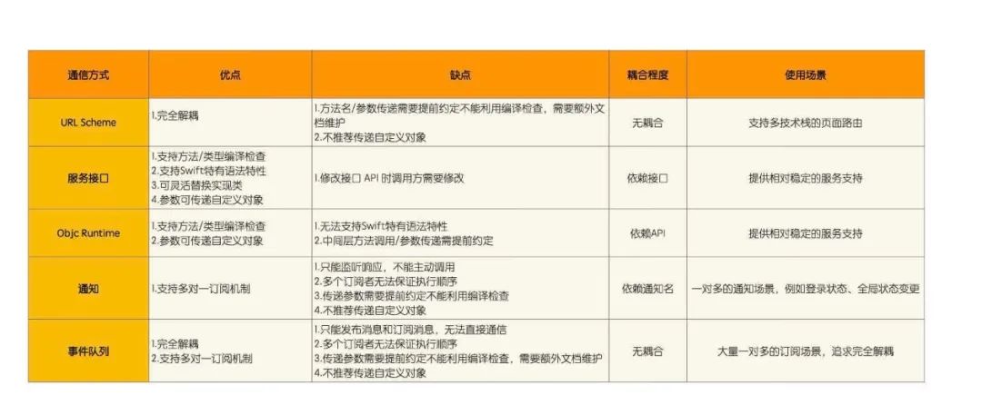 组件间的依赖方式主要分为直接强耦合依赖和间接松耦合依赖。强耦合依赖是对依赖的组件直接使用对应的API进行调用,这种调用方式优点是简单直接性能更好,缺点是一种完全耦合的调用方式。(基础组件通常使用这种方式)。松耦合依赖主要是通过通知、URL Scheme、ObjC Runtime、服务接口、事件队列等通信方式进行间接依赖调用。虽然性能相对差一点,但这是一种相对耦合程度比较低并且灵活的依赖方式。(业务组件通常使用这种方式)