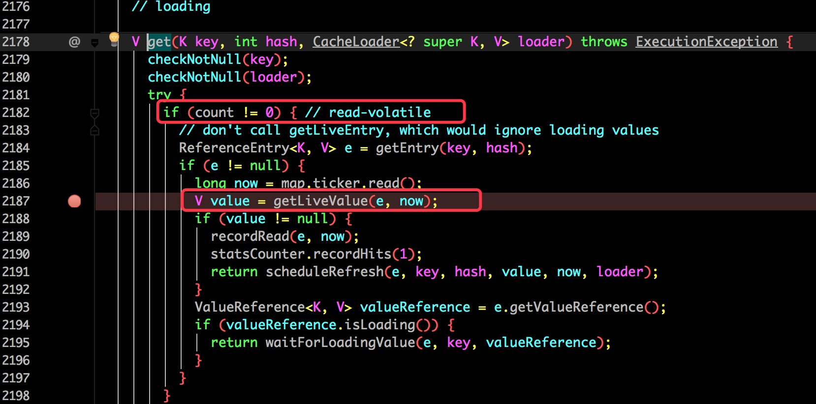 再跟进去之前第 2182 行会发现先要判断 count 是否大于 0,这个 count 保存的是当前缓存的数量,并用 volatile 修饰保证了可见性。