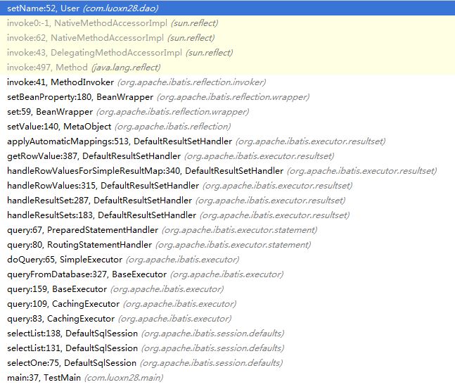 metaValue.setValue方法最后会调用到Java类中对应数据域的set方法,这样也就完成了SQL查询结果集的Java类封装过程。最后贴一张调用栈到达Java类的set方法中的快照: