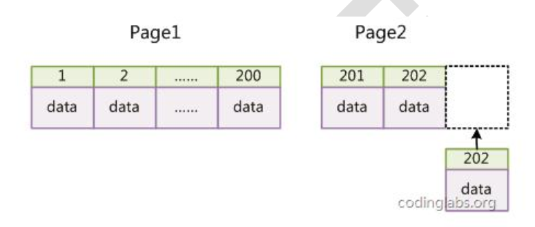同时,请尽量在 InnoDB 上采用自增字段做表的主键。因为 InnoDB 数据文件本身是一棵B+Tree,非单调的主键会造成在插入新记录时数据文件为了维持 B+Tree 的特性而频繁的分裂调整,十分低效,而使用自增字段作为主键则是一个很好的选择。如果表使用自增主键,那么每次插入新的记录,记录就会顺序添加到当前索引节点的后续位置,当一页写满,就会自动开辟一个新的页。如下图所示: